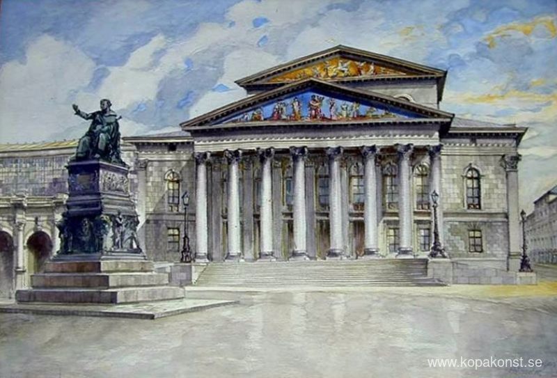 Vi erbjuder dig en hantverksmässig reproduktion på duk av det berömda konstverket 'Münchens operahus' av Adolf Hitler, från Reproduktionsmuseet.