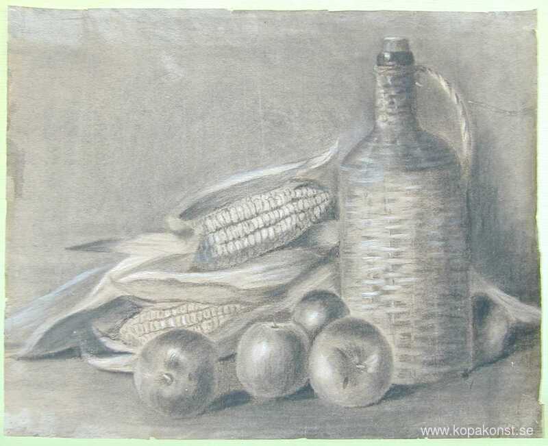Vi erbjuder dig en hantverksmässig reproduktion på duk av det berömda konstverket 'Stilleben med flaska och frukt' av Adolf Hitler, från Reproduktionsmuseet.
