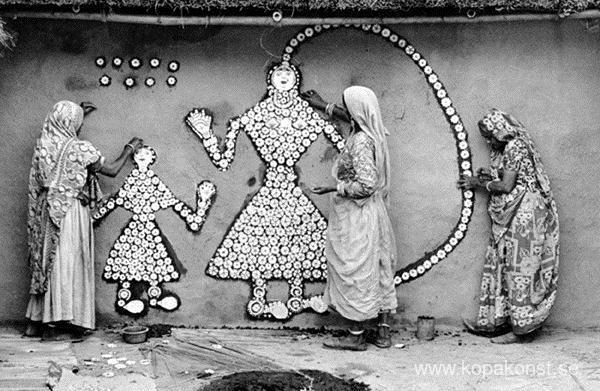Vi erbjuder dig en hantverksmässig reproduktion på duk av det berömda konstverket 'Kvinnor som gör en Samha Devi-bild, Haryana' av Jyoti Bhatt, från Reproduktionsmuseet.