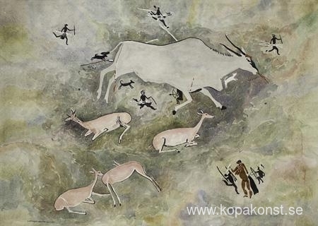 Vi erbjuder dig en hantverksmässig reproduktion på duk av det berömda konstverket 'Bergkonst - Figurer & Buck' av Walter Battiss, från Reproduktionsmuseet.