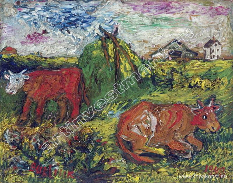 Vi erbjuder dig en hantverksmässig reproduktion på duk av det berömda konstverket 'Fält med boskap' av David Burliuk, från Reproduktionsmuseet.