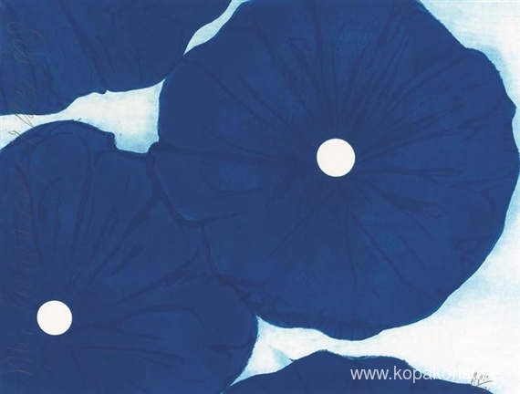 Vi erbjuder dig en hantverksmässig reproduktion på duk av det berömda konstverket 'Fyra blå blommor, 19 maj 1999' av Donald Sultan, från Reproduktionsmuseet.
