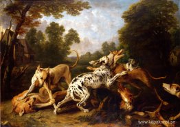Stilleben med döda harar och fåglar, fåtölj, hundar, jaktpistol