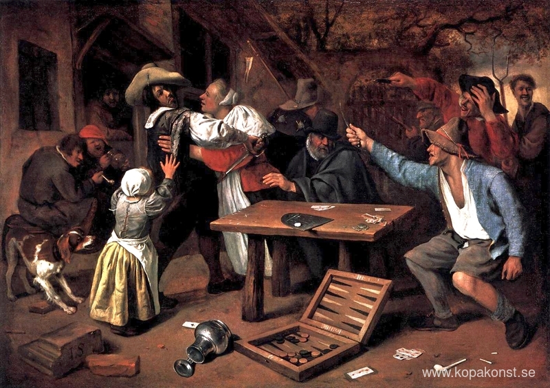 Vi erbjuder dig en hantverksmässig reproduktion på duk av det berömda konstverket 'Argument om ett kortspel' av Jan Steen, från Reproduktionsmuseet.