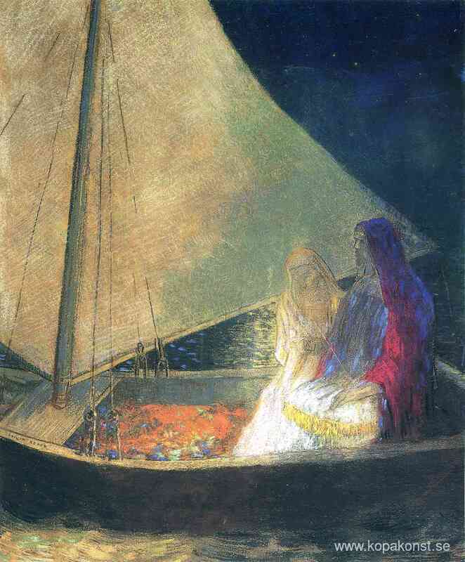 Vi erbjuder dig en hantverksmässig reproduktion på duk av det berömda konstverket 'Båt med två figurer' av Odilon Redon, från Reproduktionsmuseet.