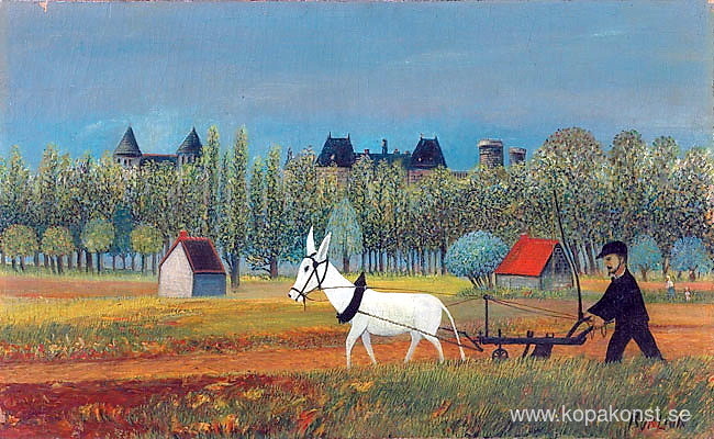 Vi erbjuder dig en hantverksmässig reproduktion på duk av det berömda konstverket 'Bonde som arbetar på ett fält' av David Burliuk, från Reproduktionsmuseet.