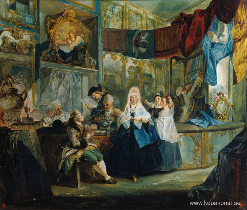 Vi erbjuder dig en hantverksmässig reproduktion på duk av det berömda konstverket 'Butiken' av Luis Paret y Alcazar, från Reproduktionsmuseet.
