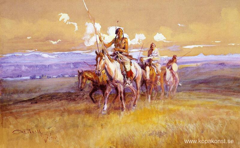 Vi erbjuder dig en hantverksmässig reproduktion på duk av det berömda konstverket 'Indiskt parti ' av Charles M. Russell, från Reproduktionsmuseet.