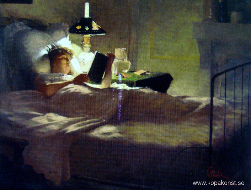 Vi erbjuder dig en hantverksmässig reproduktion på duk av det berömda konstverket 'Kvällsläsning' av Georg Pauli, från Reproduktionsmuseet.