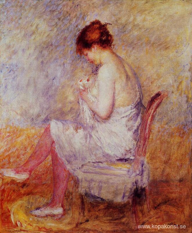Vi erbjuder dig en hantverksmässig reproduktion på duk av det berömda konstverket 'Kvinna i en Chemise' av Pierre-Auguste Renoir, från Reproduktionsmuseet.