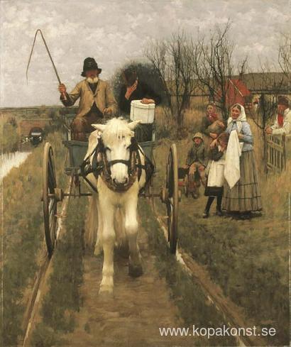 Vi erbjuder dig en hantverksmässig reproduktion på duk av det berömda konstverket 'Lämnar hemmet' av Henry Herbert La Thangue, från Reproduktionsmuseet.