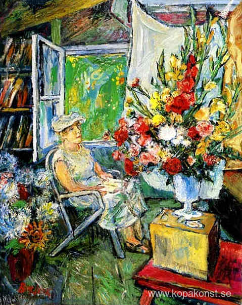 Vi erbjuder dig en hantverksmässig reproduktion på duk av det berömda konstverket 'Marusia i biblioteket' av David Burliuk, från Reproduktionsmuseet.
