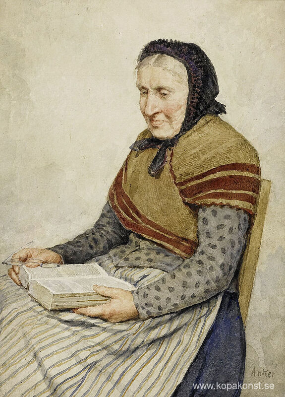 Vi erbjuder dig en hantverksmässig reproduktion på duk av det berömda konstverket 'Mormor läser Bibeln' av Albert Anker, från Reproduktionsmuseet.