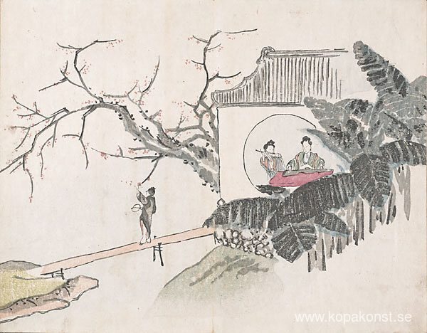 Vi erbjuder dig en hantverksmässig reproduktion på duk av det berömda konstverket 'Namnlös (figurer som spelar instrument i en trädgård)' av Ike no Taiga, från Reproduktionsmuseet.