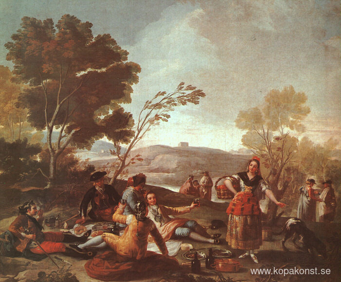 Vi erbjuder dig en hantverksmässig reproduktion på duk av det berömda konstverket 'Picknick på stranden av Manzanares' av Francisco Goya, från Reproduktionsmuseet.