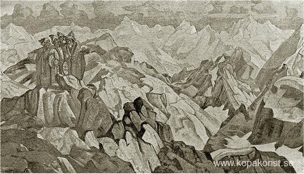 Vi erbjuder dig en hantverksmässig reproduktion på duk av det berömda konstverket 'Rikenas gräns' av Nicholas Roerich, från Reproduktionsmuseet.