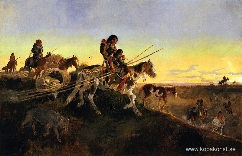 Vi erbjuder dig en hantverksmässig reproduktion på duk av det berömda konstverket 'Söker ny jaktmark ' av Charles M. Russell, från Reproduktionsmuseet.