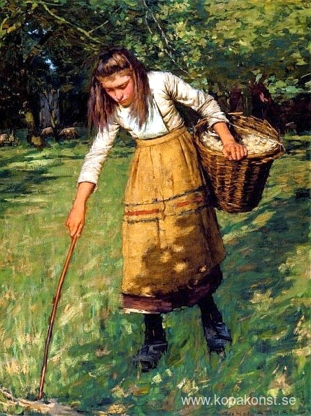 Vi erbjuder dig en hantverksmässig reproduktion på duk av det berömda konstverket 'Samla ull' av Henry Herbert La Thangue, från Reproduktionsmuseet.