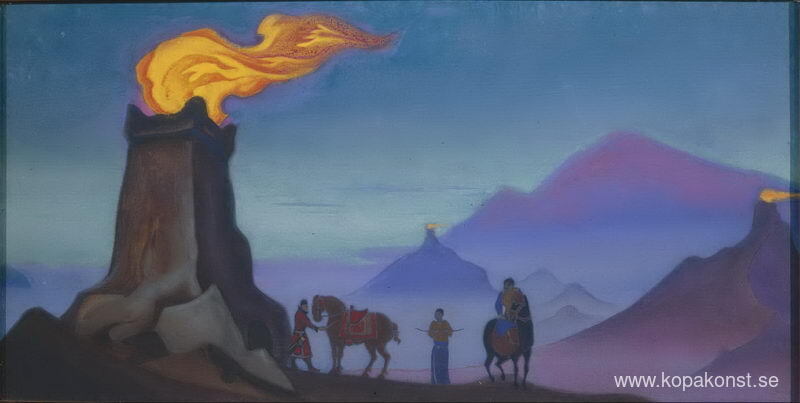 Vi erbjuder dig en hantverksmässig reproduktion på duk av det berömda konstverket 'Segerns eld (Sentinel tänds på tornen i Gobi)' av Nicholas Roerich, från Reproduktionsmuseet.