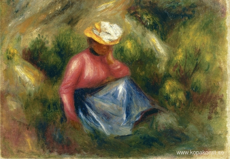 Vi erbjuder dig en hantverksmässig reproduktion på duk av det berömda konstverket 'Sittande ung flicka med hatt' av Pierre-Auguste Renoir, från Reproduktionsmuseet.