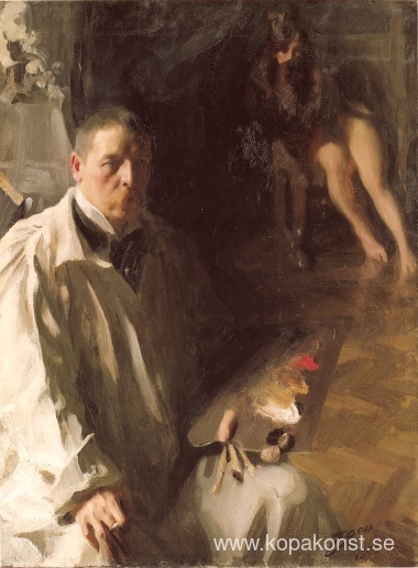 Vi erbjuder dig en hantverksmässig reproduktion på duk av det berömda konstverket 'Självporträtt med modell' av Anders Zorn, från Reproduktionsmuseet.