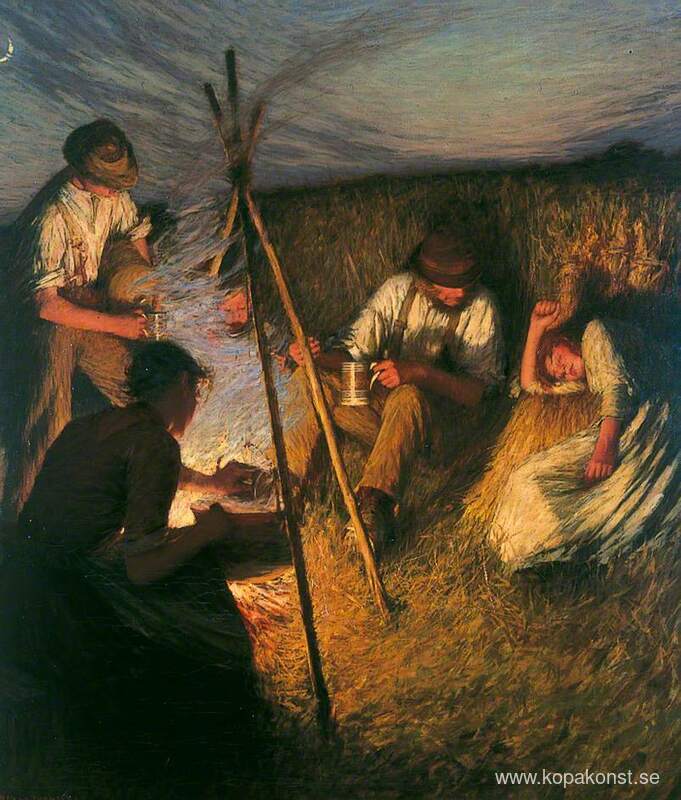 Vi erbjuder dig en hantverksmässig reproduktion på duk av det berömda konstverket 'Skördarnas måltid' av Henry Herbert La Thangue, från Reproduktionsmuseet.