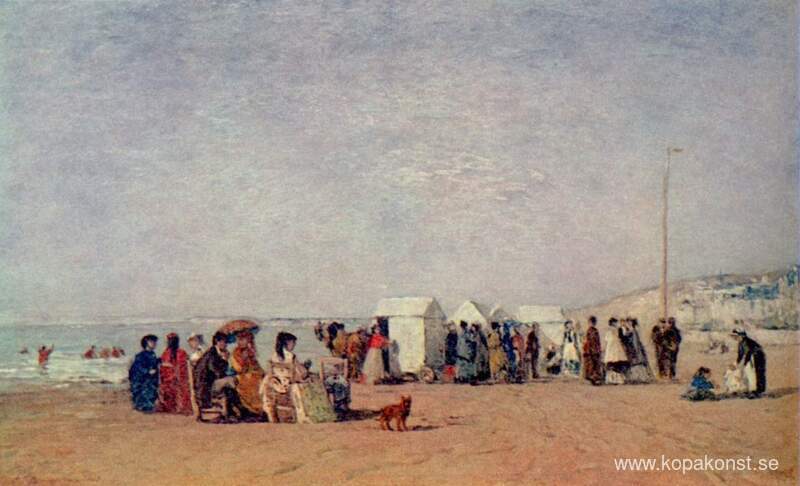Vi erbjuder dig en hantverksmässig reproduktion på duk av det berömda konstverket 'Strand i Trouville' av Eugene Boudin, från Reproduktionsmuseet.