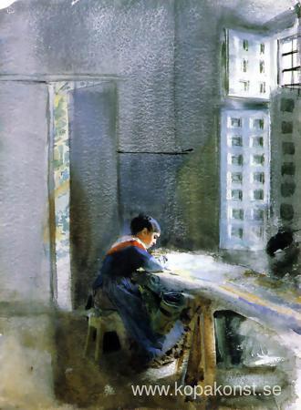 Vi erbjuder dig en hantverksmässig reproduktion på duk av det berömda konstverket 'Tapetfabrik' av Anders Zorn, från Reproduktionsmuseet.