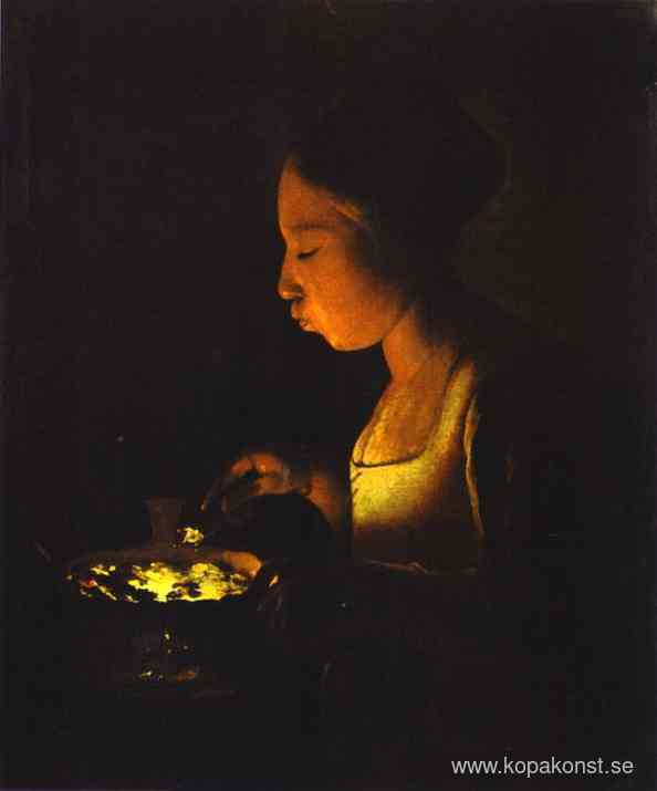 Vi erbjuder dig en hantverksmässig reproduktion på duk av det berömda konstverket 'Tjej med en brazier' av Georges de la Tour, från Reproduktionsmuseet.