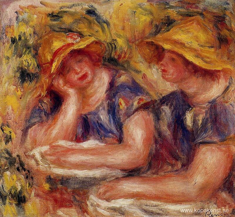 Vi erbjuder dig en hantverksmässig reproduktion på duk av det berömda konstverket 'Två kvinnor i blå blusar' av Pierre-Auguste Renoir, från Reproduktionsmuseet.