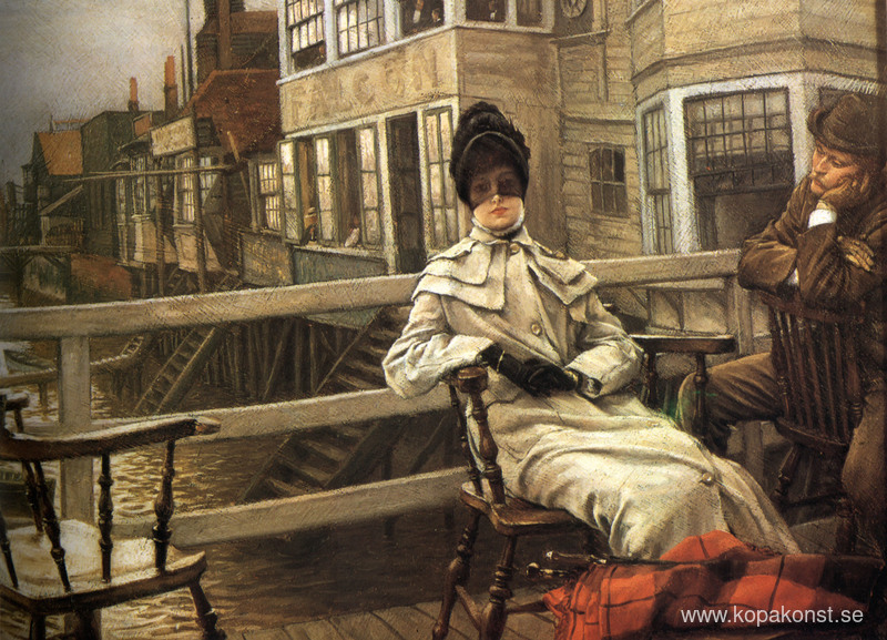 Vi erbjuder dig en hantverksmässig reproduktion på duk av det berömda konstverket 'Väntar på färjan' av James Tissot, från Reproduktionsmuseet.