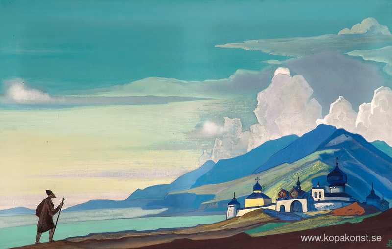 Vi erbjuder dig en hantverksmässig reproduktion på duk av det berömda konstverket 'Vandrare från den lysande staden' av Nicholas Roerich, från Reproduktionsmuseet.