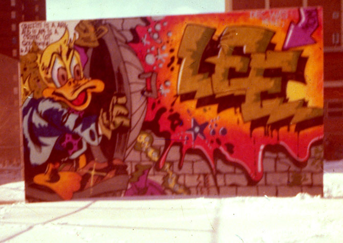 Vi erbjuder dig en hantverksmässig reproduktion på duk av det berömda konstverket 'Howard the Duck' av Lee Quinones, från Reproduktionsmuseet.