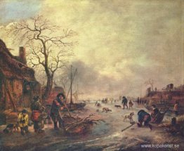 Ett vinterlandskap med skridskoåkare, barn som leker Kolf och fi