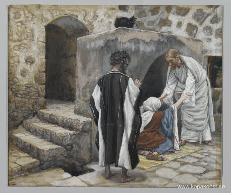 Vi erbjuder dig en hantverksmässig reproduktion på duk av det berömda konstverket 'Helande av Peters svärmor (La guérison de la belle-mère de Pierr' av James Tissot, från Reproduktionsmuseet.