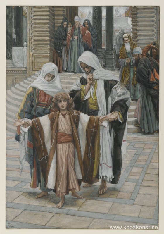 Vi erbjuder dig en hantverksmässig reproduktion på duk av det berömda konstverket 'Jesus hittades i templet' av James Tissot, från Reproduktionsmuseet.