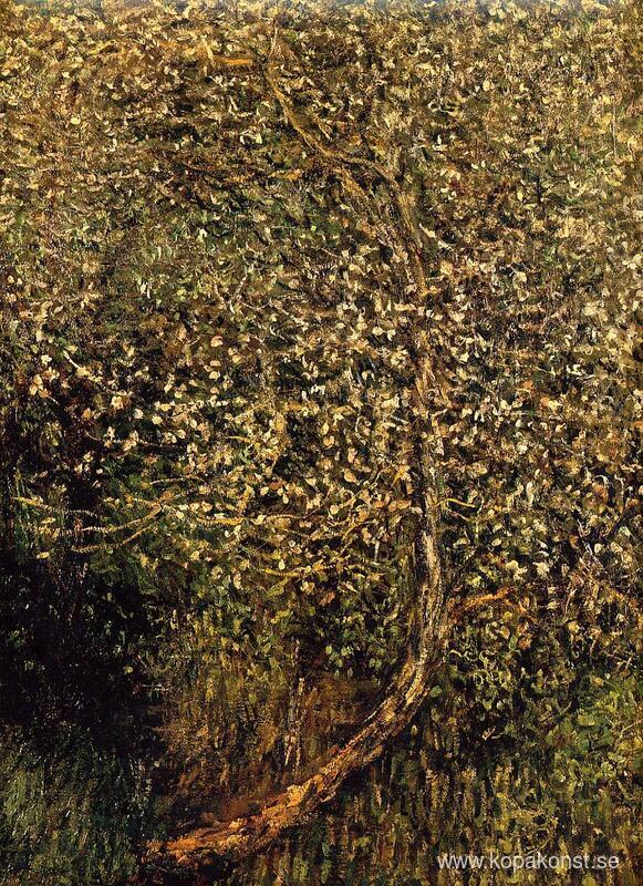 Vi erbjuder dig en hantverksmässig reproduktion på duk av det berömda konstverket 'Äppelträd i blom vid vattnet' av Claude Monet, från Reproduktionsmuseet.