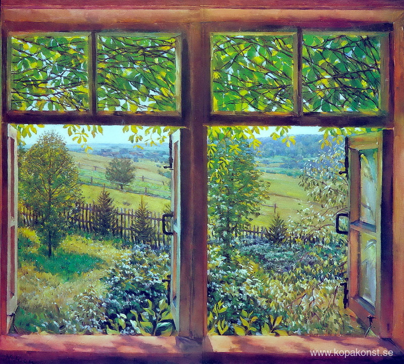 Vi erbjuder dig en hantverksmässig reproduktion på duk av det berömda konstverket 'Öppna fönstret. Ligachevo' av Konstantin Yuon, från Reproduktionsmuseet.