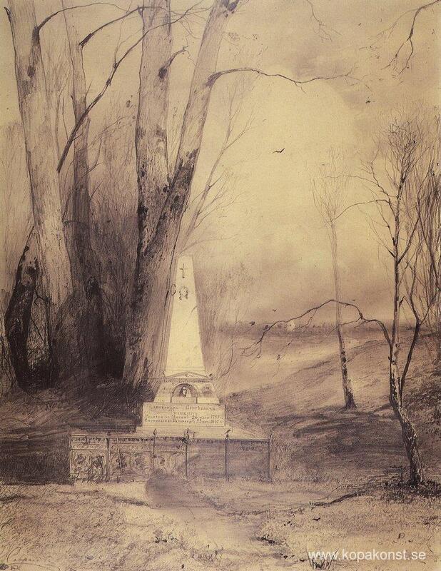 Vi erbjuder dig en hantverksmässig reproduktion på duk av det berömda konstverket 'Alexander Pushkins grav i Svyatogorsky-klostret' av Aleksey Savrasov, från Reproduktionsmuseet.