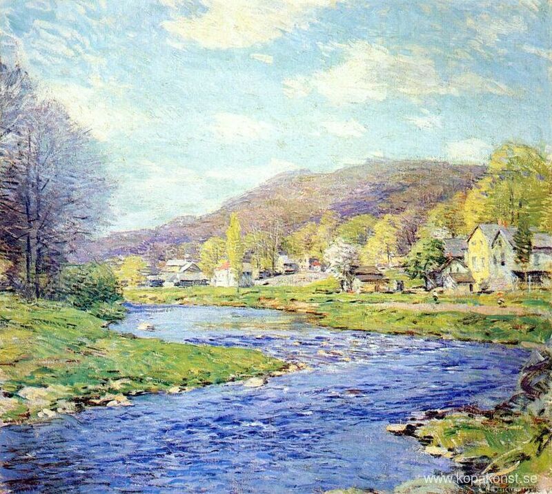 Vi erbjuder dig en hantverksmässig reproduktion på duk av det berömda konstverket 'Bäck i juni' av Willard Metcalf, från Reproduktionsmuseet.