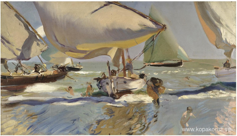 Vi erbjuder dig en hantverksmässig reproduktion på duk av det berömda konstverket 'Båtar på stranden' av Joaquín Sorolla, från Reproduktionsmuseet.