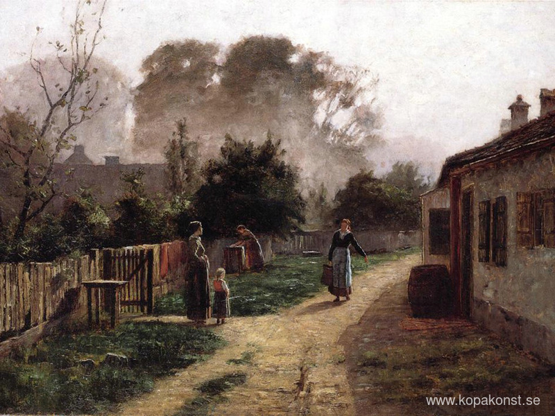 Vi erbjuder dig en hantverksmässig reproduktion på duk av det berömda konstverket 'Byscen' av T. C. Steele, från Reproduktionsmuseet.