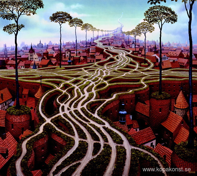 Vi erbjuder dig en hantverksmässig reproduktion på duk av det berömda konstverket 'Erosion' av Jacek Yerka, från Reproduktionsmuseet.