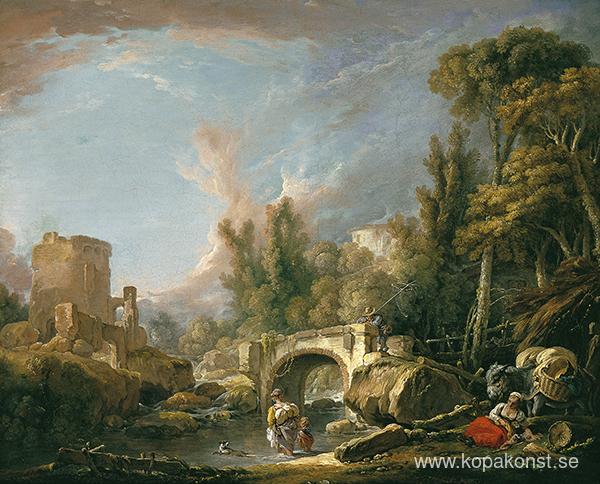 Vi erbjuder dig en hantverksmässig reproduktion på duk av det berömda konstverket 'Flodlandskap med ruin och bro' av Francois Boucher, från Reproduktionsmuseet.