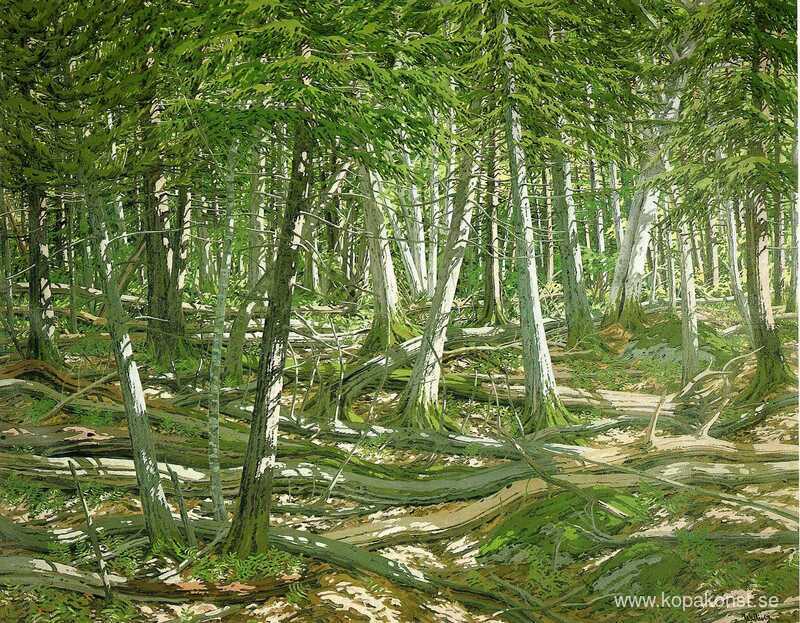 Vi erbjuder dig en hantverksmässig reproduktion på duk av det berömda konstverket 'Gamla vindfall' av Neil Welliver, från Reproduktionsmuseet.