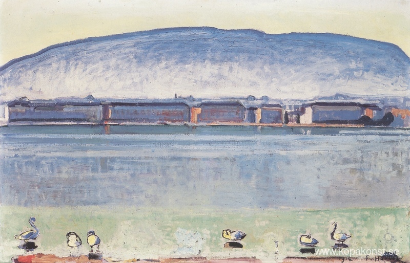 Vi erbjuder dig en hantverksmässig reproduktion på duk av det berömda konstverket 'Genèvesjön med sex svanar' av Ferdinand Hodler, från Reproduktionsmuseet.