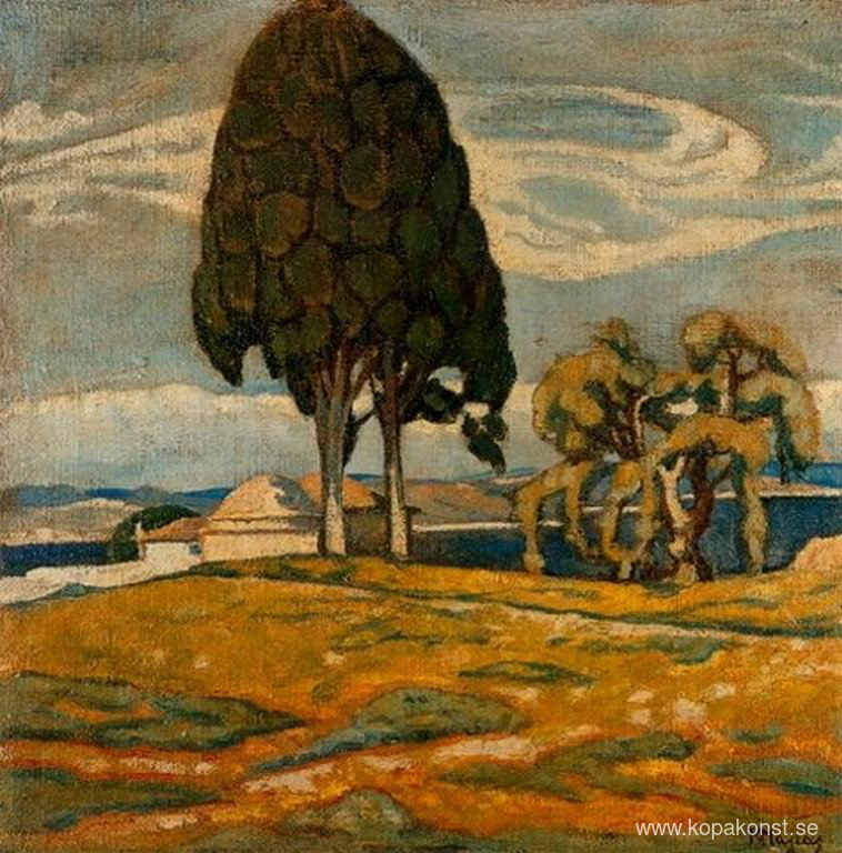 Vi erbjuder dig en hantverksmässig reproduktion på duk av det berömda konstverket 'Kapell med träd' av Constantine Maleas, från Reproduktionsmuseet.