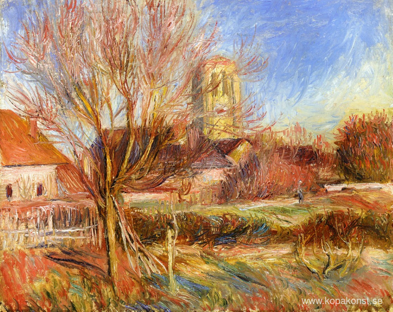 Vi erbjuder dig en hantverksmässig reproduktion på duk av det berömda konstverket 'Kyrkan i Essoyes' av Pierre-Auguste Renoir, från Reproduktionsmuseet.
