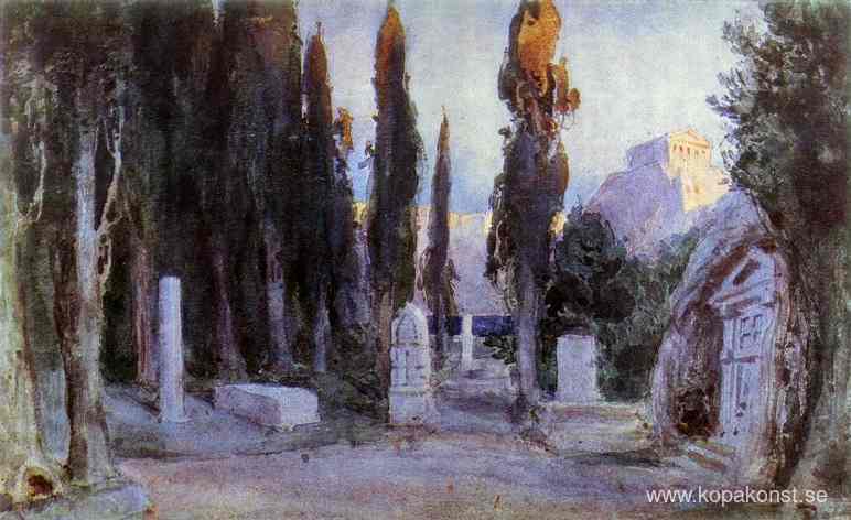 Vi erbjuder dig en hantverksmässig reproduktion på duk av det berömda konstverket 'Kyrkogård' av Vasily Polenov, från Reproduktionsmuseet.