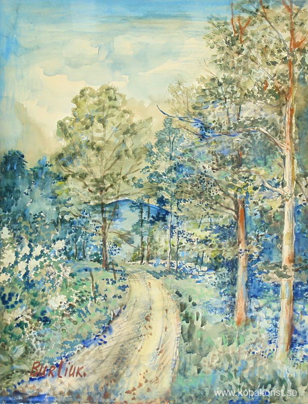 Vi erbjuder dig en hantverksmässig reproduktion på duk av det berömda konstverket 'Landskap med blå berg' av David Burliuk, från Reproduktionsmuseet.